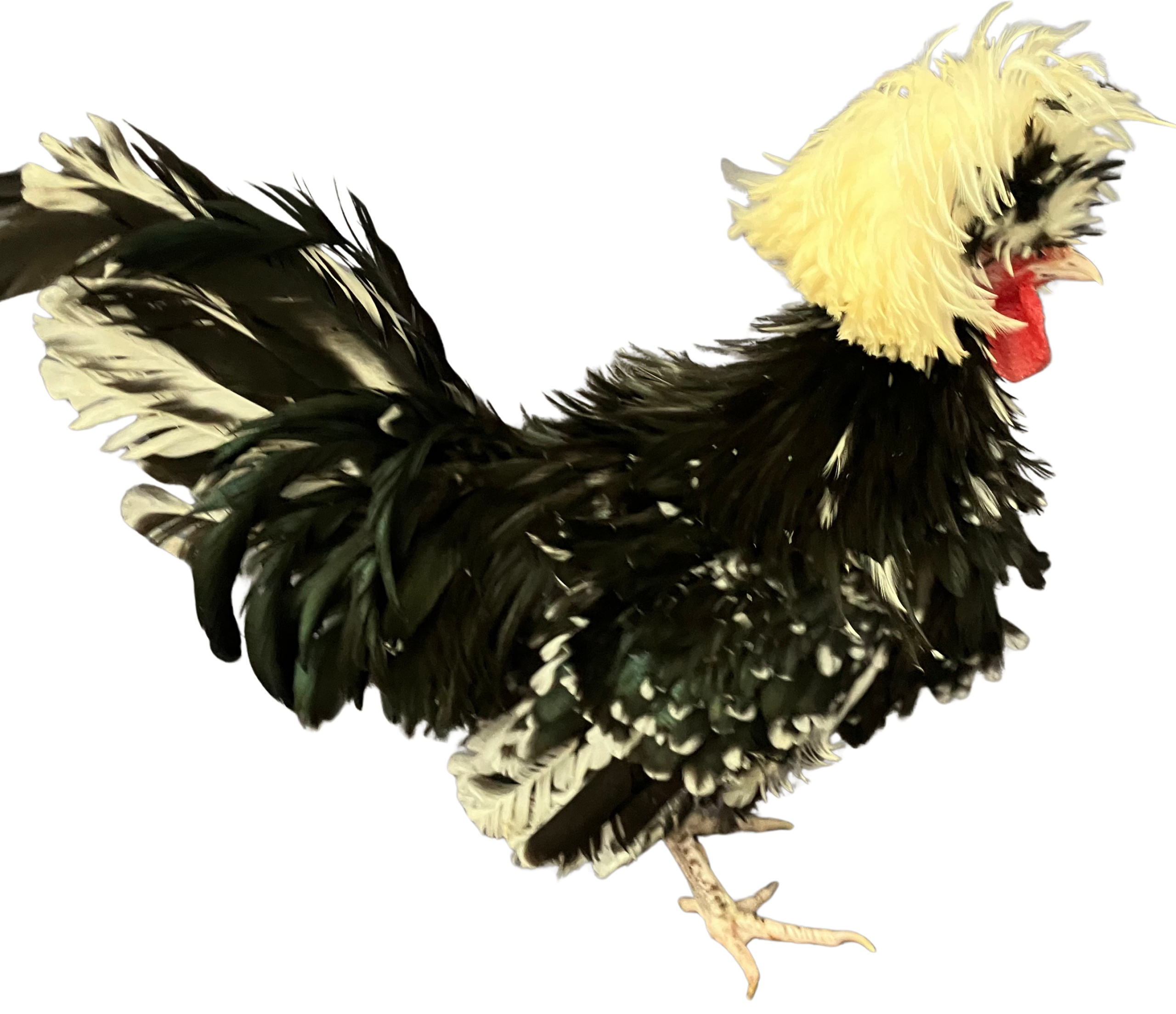 La característica más distintiva de la gallina Holandesa Moñuda es el moño que crece en la parte posterior de su cabeza. Este moño está formado por plumas especiales que crecen hacia atrás desde la cresta. Aparte de esto, estas gallinas pueden tener una variedad de colores de plumaje, siendo los más comunes el blanco y el negro.